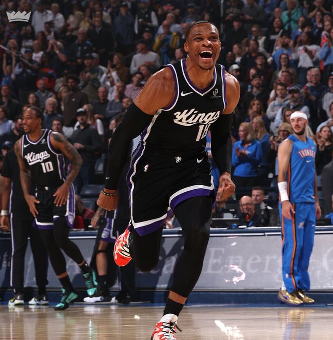 国王对威少重返俄城的第一场比赛也十分重视,他们甚至摆出了一套三后卫的先发阵容,威少是先发的一号位,搭档施罗德、拉文,让拉文移动到了小前锋的位置。