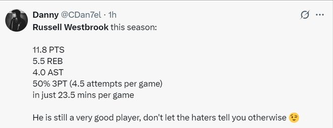 本赛季威少出战的比赛场均23.5分钟,拿到11.8分5.5篮板4助攻,三分命中率高达50%。雷霆球迷写道:威少依旧是非常出色的球员,别让外界的诋毁影响你。